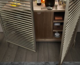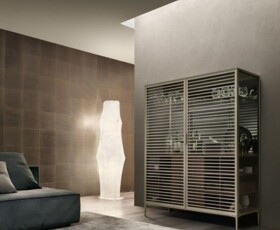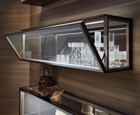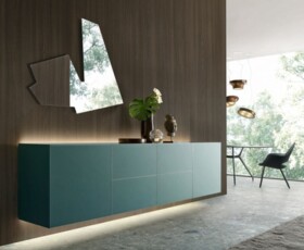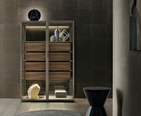 L’estetica del vetro laccato interpreta i contenitori per la zona giorno.